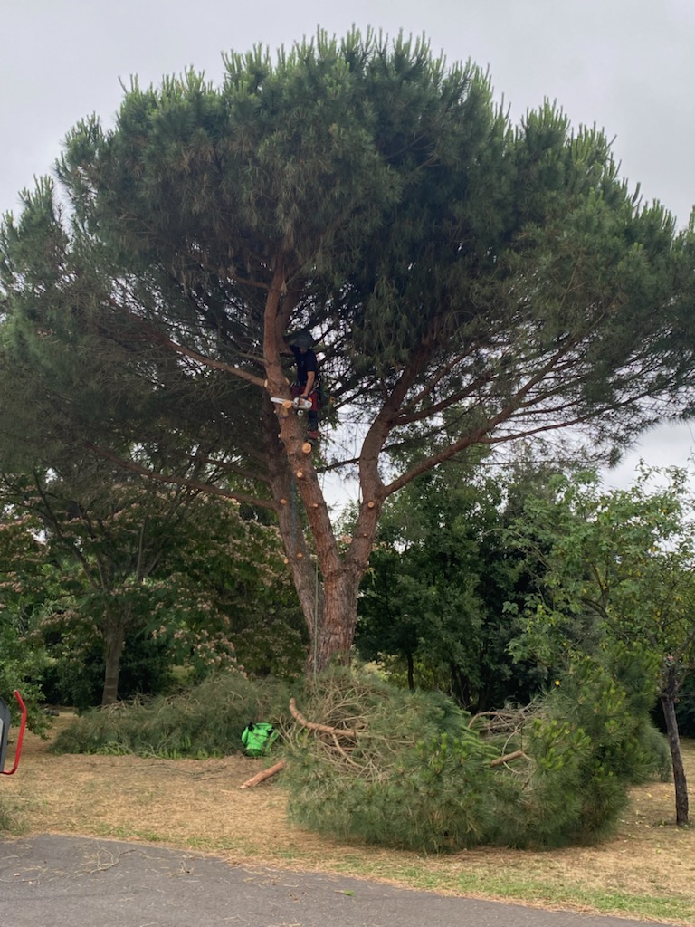 Le jour de l'abattage, l'équipe de SOINS DES CIMES a mis en œuvre son plan avec professionnalisme et précision. En utilisant des techniques spécialisées, le pin parasol a été abattu en sections contrôlées, évitant ainsi tout dommage aux alentours.